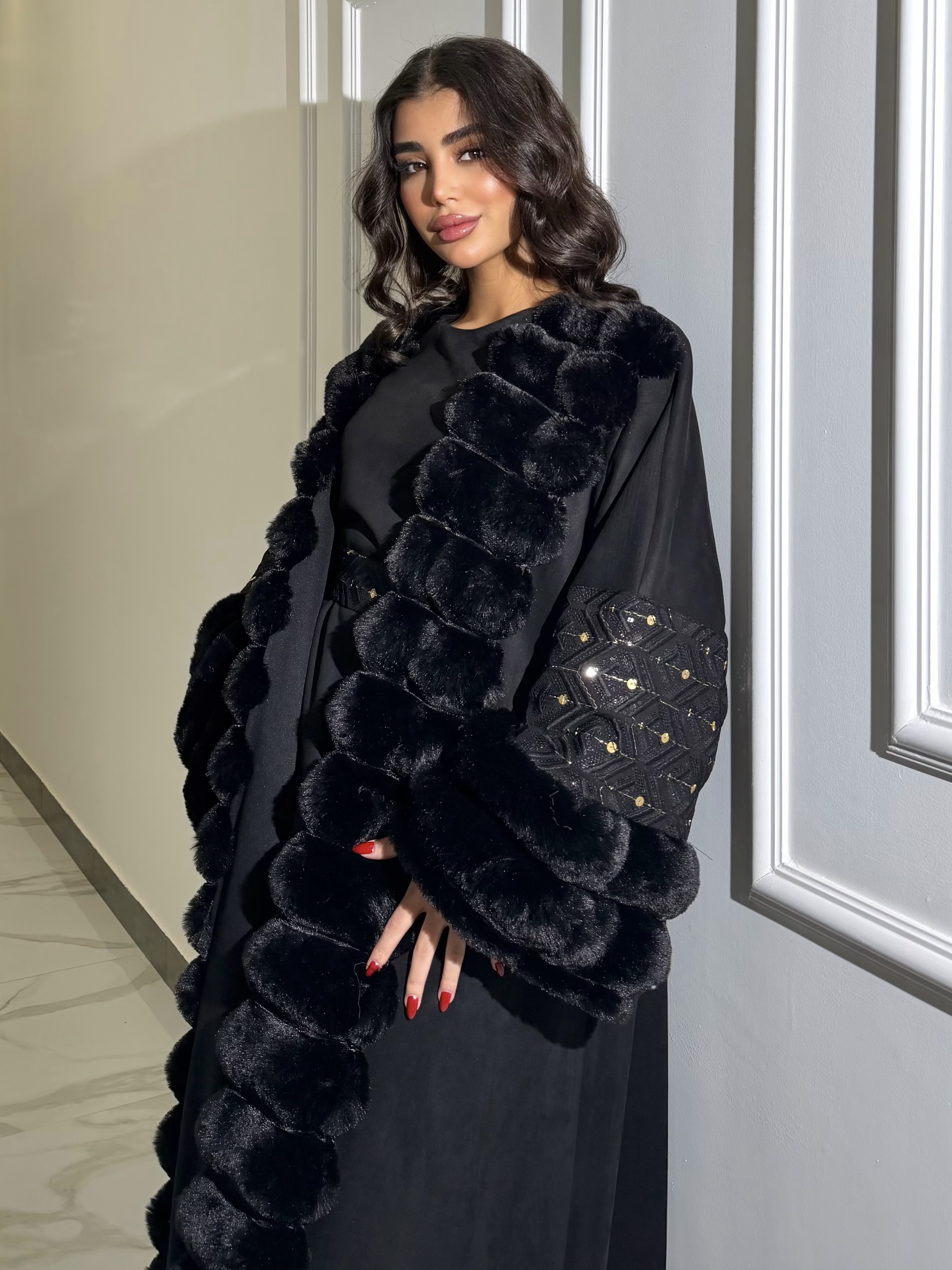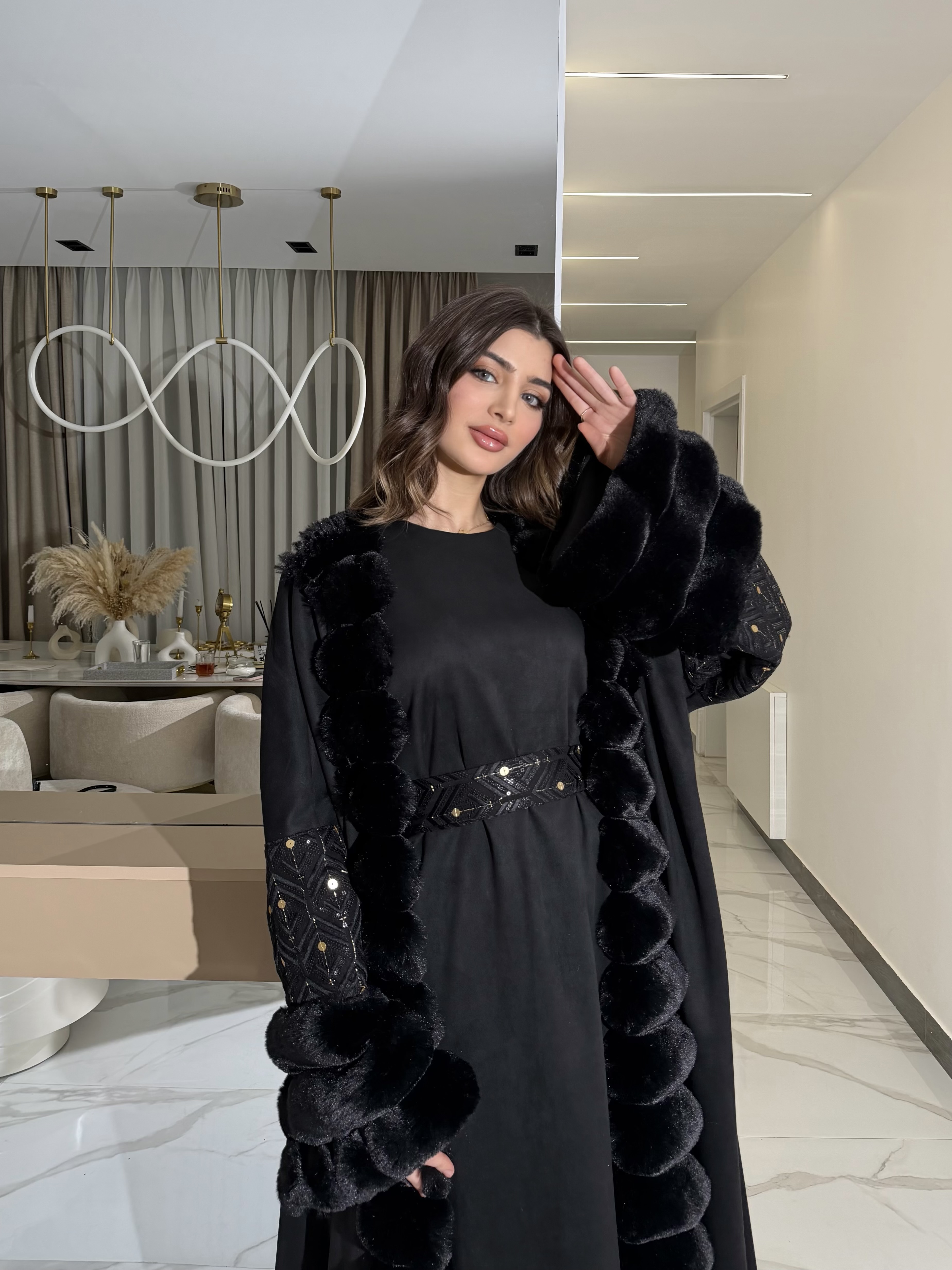 Embroidered Fur Bisht with Suede Dress جلابية شموخ الفرو